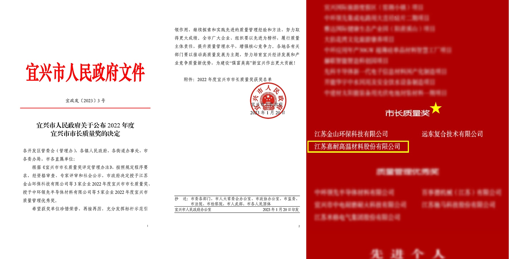 2023年1月20日,宜興市人民政府發(fā)文《宜興市人民政府關(guān)于公布 2022 年度宜興市市長質(zhì)量獎的決定》,根據(jù)《宜興市市長質(zhì)量獎評定管理辦法》,按照規(guī)定程序要求,經(jīng)資格審查、專家評審和社會公示,江蘇嘉耐高溫材料股份有限公司斬獲殊榮。