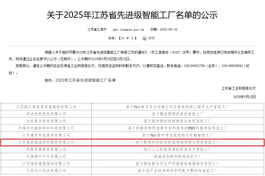 喜報!嘉耐股份入選江蘇省先進級智能工廠